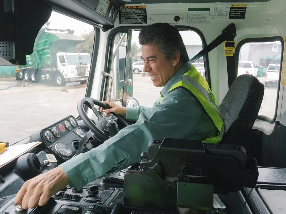 我在早上6:45打卡。每天早上我们都有一个由路线经理主持的安全会议。我们讨论刹车、安全带或有时客户服务等话题。这非常非常重要。然后我出去,检查卡车,检查轮胎,检查灯光。之后,我进行刹车测试,拔掉油门,启动卡车检查液压系统。之后我们离开车场,开始路线,收集垃圾。