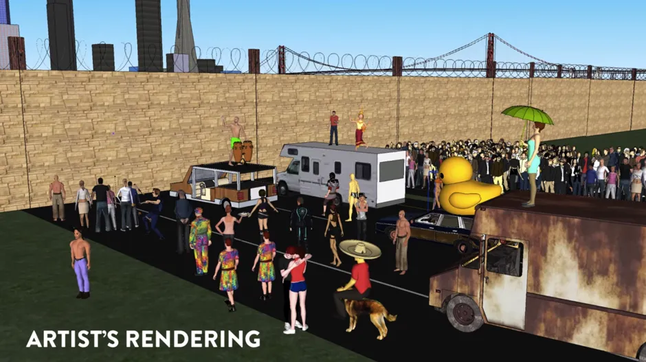 一位艺术家对一座300英里长的墙的印象,这座墙旨在阻止参与者永远返回旧金山。Cultivated Wit一个 MegaGogo 的活动,旨在在燃烧人节期间在湾区周围建立一座巨大的墙——因此永远将参与者排除在旧金山之外——短时间内筹集了超过20亿美元。在活动剩下24天的情况下, 创始人 正在朝着他们73亿美元的目标稳步前进。