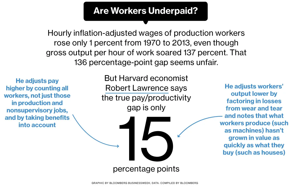 但哈佛大学经济学家罗伯特·劳伦斯的新研究挑战了工人的工资未能跟上生产率增长的观点——即他们每小时的工作产出。劳伦斯表示,传统的比较低估了工人的工资,并高估了他们的产出——即他们创造的商品或服务的价值。在工资方面,他包括了福利,并计算了所有工人的工资,而不仅仅是生产和非监督工人的工资。在产出方面,他扣除了折旧——即必须在某个时候更换的工厂和设备的磨损,以捕捉工人的净产出而非总产出。他计算出,工人生产的商品和服务的价值并没有像他们消费的商品和服务的价值那样迅速上升,导致他们的购买力停滞。劳伦斯并不否认工资不平等的加剧,但他说每小时26美元的论点“忽视了所有其他解释这一差距的因素。”