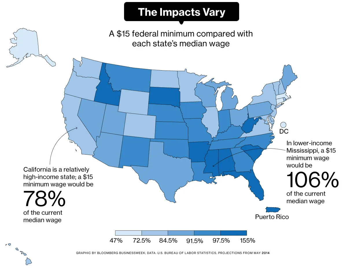 15美元的最低工资仅占高成本阿拉斯加中位工资的67%,因此如果今天实施,将对底层人群的工资有所提升,但不会影响收入阶梯中的中层。在波多黎各,15美元则占中位工资的155%。如果今天将联邦最低工资提高到15美元(而不是桑德斯提议的2020年),这将比所有波多黎各人收入的中点高出55%。这将在一个已经因7.25美元最低工资而受到压力的财政困难地区造成严重压力。即使在一个州内,制定一个适用于所有地方的最低工资也很困难。在加利福尼亚,中位工资在硅谷(技术上是圣本尼托和圣克拉拉县)超过每小时28美元,而在距离190英里外的农业小镇维萨利亚-波特维尔则低于14美元。