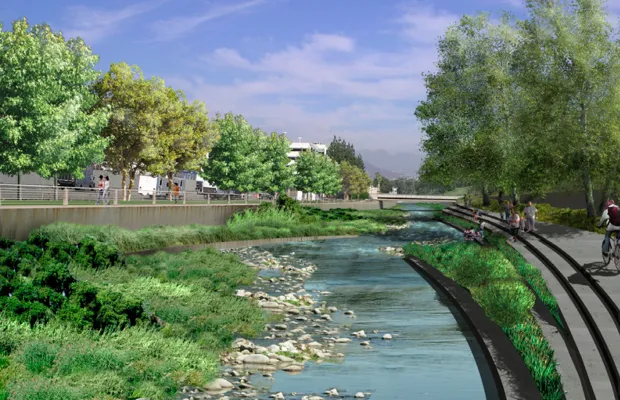 问题是,已经有一个主复兴计划,这是由城市、县、当地建筑师和倡导者团队以及美国陆军工程兵团经过多年开发的,他们现在的任务是恢复城市生态系统并增加对自然的接触。该计划呼吁在许多其他事项中,用适合栖息地的软底河床替换11英里的河流混凝土渠道,创建补充地下水的湿地,并在整个河流的全程重新开发附近土地为公共休闲空间。