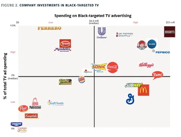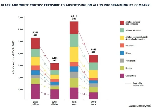 Rudd食品政策与肥胖中心根据那里的研究人员,黑人儿童和青少年接触到的汽水、含糖饮料和糖果广告的数量是白人儿童的两倍。这不仅仅是关于不同种族之间观看电视的数量:在Rudd中心分析的267家食品和饮料公司中,超过一半(55%)在2013年在面向大量黑人观众的网络上花费了超过100,000美元的广告费用,其中三分之一的公司在针对黑人市场的广告上至少花费了500,000美元。五家公司在针对非裔美国人的广告上花费超过1000万美元,包括百事可乐。 Dr. Pepper Snapple Group在其广告预算中也花费了超过平均水平的金额用于黑人观众。然而,汽水公司在这方面的表现不如糖果和口香糖品牌,后者的市场营销不成比例地针对黑人和西班牙裔消费者。