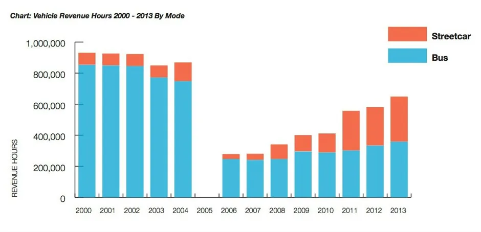 - 在卡特里娜之前,RTA每运营一个电车小时,就有六个公交收入小时(见下图)。现在这个比例几乎持平。