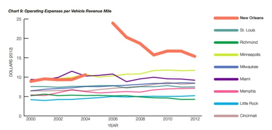乘坐新奥尔良显然,资金是问题的一个重要部分。RTA的年度运营预算在2013年降至8800万美元,远低于2004年报告的1.43亿美元,主要是因为糟糕的服务没有产生足够的票务收入。然而,它的每收入英里运营费用高于许多可比城市,包括迈阿密、明尼阿波利斯和圣路易斯。换句话说,新奥尔良不仅没有足够的资金来提供优质的交通服务,而且为其提供的服务支付了更多费用。
