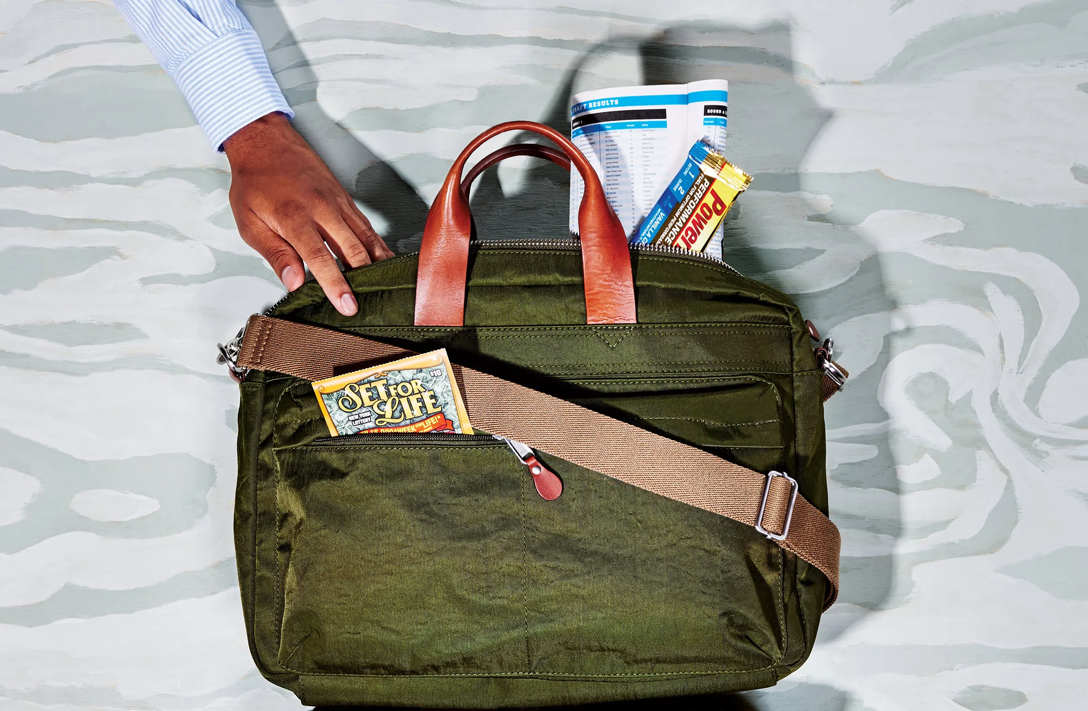 尼龙面料具有防水性能——非常适合担心下雨的早晨。摄影师:Ted Cavanaugh为《彭博商业周刊》拍摄Harwick的军绿色和窄轮廓使其类似于自行车快递员的风格。霓虹橙色的内衬有一个带衬垫的口袋用于存放笔记本电脑,还有双前口袋用于存放电缆和线缆。“许多J.Crew的包都是蜡棉或油布,”男装设计师Frank Muytjens说。“所以我们选择了尼龙面料,以创造更干净的美学和真正的功能性。”这种轻质面料还用于化妆包、旅行袋和更多将在这个秋季发布的选项。98美元;jcrew.com