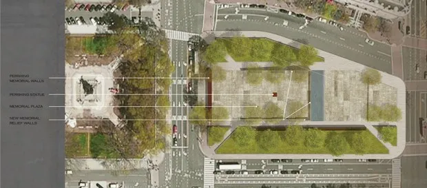 “英雄绿”设计的一部分,由Maria Counts和Counts Studio提交。美国第一次世界大战百年纪念委员会整体参赛作品中很少有——而入围设计更是没有——关注到那里现有的纪念碑,纪念美国陆军将领约翰·约瑟夫“黑杰克”佩尔辛,他在第一次世界大战期间领导美国军队。佩尔辛公园的下沉水景花园和阶梯广场由M. Paul Friedberg设计,Oehme, van Sweden & Associates公司也有贡献,使其成为华盛顿特区最具声望的公园之一。然而,这个公园多年来遭到严重忽视。喷泉和水景设施不再运作;独特的水景植物早已消失。