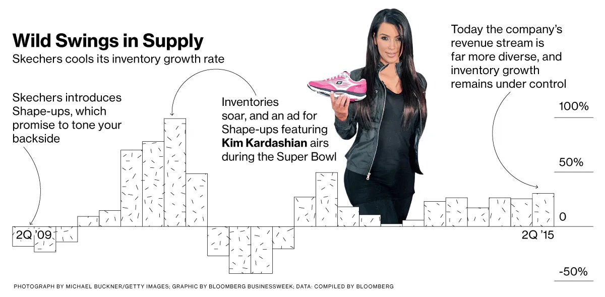 2011年2月,该公司在超级碗期间播放了一则广告,展示金·卡戴珊告别她的私人教练,转而选择一双Shape-ups。然而,到那时,这些鞋子正迅速从时尚潮流转变为失败。顾客们越来越多地以折扣价购买Shape-ups,数百万双鞋因Skechers的过量订购而滞销。“库存实在太多了,”首席运营官大卫·温伯格在超级碗广告播放后10天的财报电话会议上告诉投资者。联邦贸易委员会随后开始调查Skechers及其竞争对手关于这些鞋子健康益处的虚假广告,这并没有帮助。2012年5月,该公司否认了不当行为,但同意向FTC支付4000万美元以解决其欺骗顾客的指控,并被禁止做出关于减肥和增强的无支持声明。