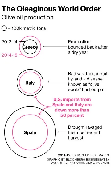 糟糕的天气、神秘的树病以及以橄榄为食的果蝇已经摧毁了意大利的橄榄园。普利亚的1000万棵橄榄树中近十分之一感染了一种被称为“橄榄埃博拉”的疾病(一些科学家认为是名为Xylella fastidiosa的细菌),这种细菌会慢慢杀死树木。因此,意大利的橄榄油生产商正准备迎接又一个糟糕的季节,2014-15年产量下降34%,降至302,000公吨,根据总部位于马德里的国际橄榄理事会(IOC)的数据。西班牙的产量在最近一个季节下降了一半以上,降至825,700吨,并可能因持续干旱而保持低迷。