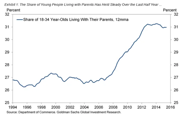 自复苏开始(2010年)以来,18至34岁的人群中与父母同住的比例实际上是增加的。根据最新数据,大约三分之一的千禧一代与父母共享居住空间。虽然这一比例在2014年下半年停止增长,但并没有出现任何实质性的变化。尽管经济复苏,他们仍然 被困。