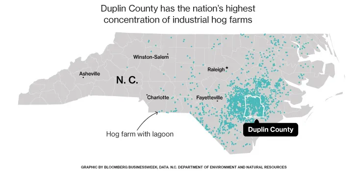 北卡罗来纳州家禽产业的扩张正在增加环境危害。尽管自上世纪90年代末以来,猪粪池的总数已被限制,但鸡肉生产从1992年的5.59亿只增长到去年的7.95亿只,增长超过42%。从小飞机上俯瞰杜普林县,很容易看到长长的金属屋顶鸡舍。家禽产生的液体废物不如猪多,但其粪便也会在田地上施用,并可能释放氮进入地下水或水道。