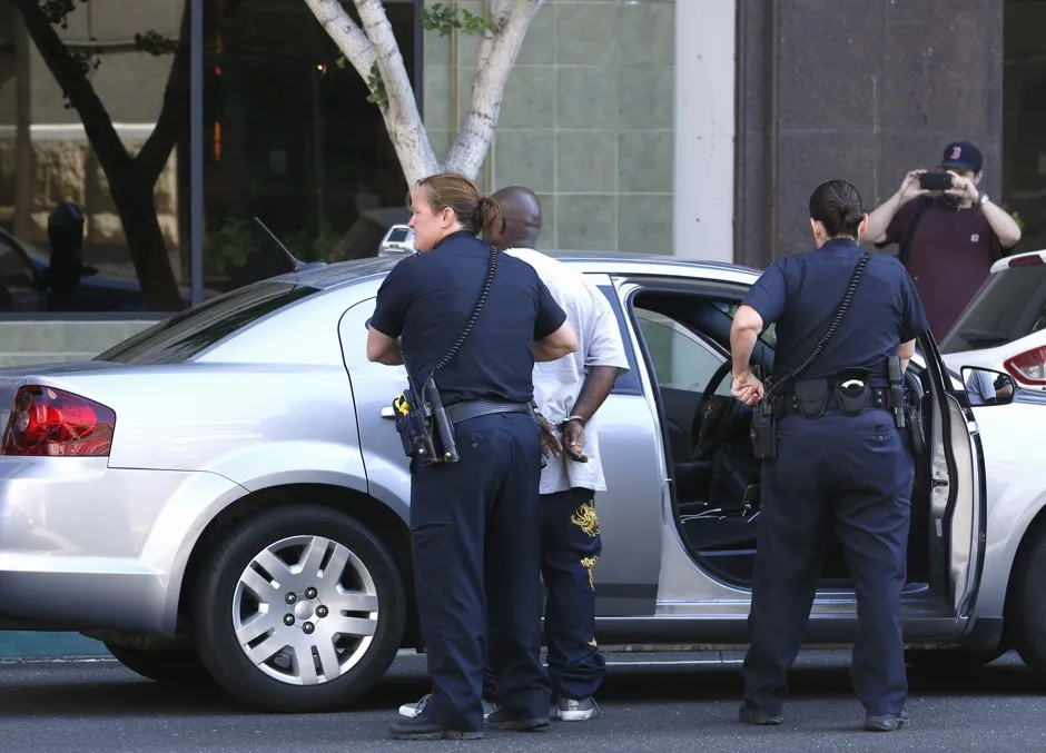在2015年6月24日的照片中,右侧的一名人士记录了萨克拉门托警察将一名嫌疑人拘留的情景。美联社照片/里奇·佩德朗切利在8月2日星期日的清晨,手持相机的活动家安东尼奥·布赫勒再次被奥斯汀警察局铐住。