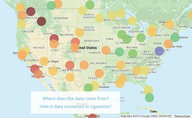 一个名为 分享我的空气 的新互动图形通过将城市的实时空气质量数据转换为吸烟的香烟数量、与吸烟者共处的时间以及与吸烟者生活的时间,消除了这种困惑。凯文·科农宁科创建该程序以传达肮脏空气如何影响个人健康,并鼓励人们减少他们的地方空气污染足迹。