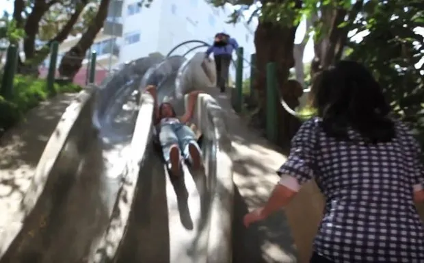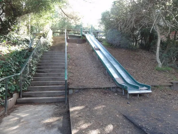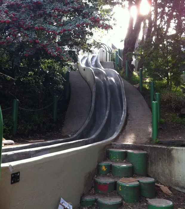 最不寻常的滑梯位于 苏厄德迷你公园,这是一个在1970年代建造的宁静角落,居民们 坐在抗议开发商的推土机。根据城市的 公园与娱乐部门,这些弯曲的并排滑梯是由一个14岁的男孩设计的: