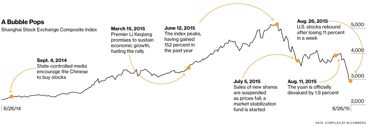 政府的第一个错误是鼓励普通中国人投资于类似赌场的中国股市,从而将其声望寄托于市场的上涨。到6月12日,上海综合指数今年上涨了152%。当投机狂潮最终冷却时,李克强总理和副总理马凯领导了阻止价格下跌的努力,禁止主要股东出售股票,停止首次公开募股,并使用政府资金购买股票。这在一段时间内有效,但最终市场还是屈服于投资者的恐惧。