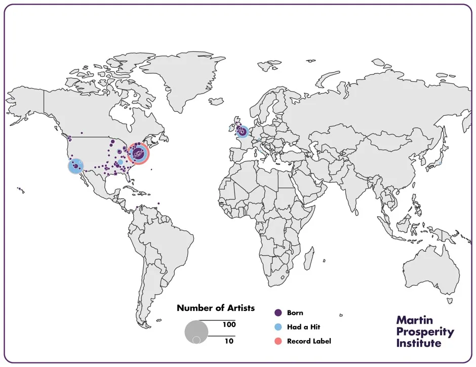 尽管关于地方音乐场景增长的讨论很多,以及互联网和数字音乐的兴起使人们能够在任何地方创作音乐,但流行音乐的地理分布仍然极为不均,主要由三个超级城市主导。纳什维尔的泰勒·斯威夫特因而著名地搬到了纽约,并在写了一首关于这座城市的歌曲后,迅速成为了这座城市的音乐大使。这座城市也是碧昂丝和Lady Gaga等超级明星的家园。来自田纳西州的麦莉·赛勒斯也迁到了洛杉矶。如果这些名人的集中程度可以作为任何指标,那么吸引到这三座超级城市的明星们,正是塑造流行音乐宇宙数十年的关键。