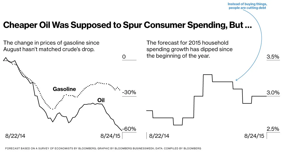 在8月19日的研究报告中,高盛承认它高估了廉价石油和更高工资对个人消费的影响,过去一年个人消费增长了2.3%,而不是该银行在3月预测的4%。最初,美国人将未在加油站消费的部分存入储蓄。家庭储蓄的收入比例回到了4.8%,正好是2014年6月的水平,此后在今年早些时候攀升至5.4%。高盛表示,现在的问题是收入增长没有预期的那么快。资本经济学的高级国际经济学家安德鲁·肯宁汉姆表示,较低的油价并没有在任何主要经济体中导致消费的显著增加。