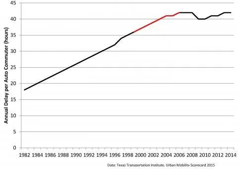 自1994年以来,德克萨斯A&M大学研究的前100个地方中,几乎所有地方的拥堵情况都在恶化,按照他们的旅行时间指数来衡量。然而,在此期间,这些地方中有92个的每人道路里程有所增加。……是的,为了试图更快地移动车辆而进行更多的道路建设往往会使交通变得更糟。