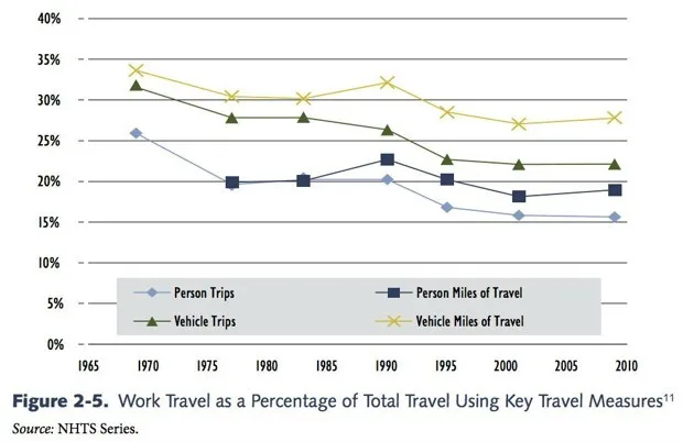 因此,通过将城市出行简化为高峰时段通勤,你错过了白天20多个小时的窗口,在这段时间内,都市地区的道路系统使用不足(如果不是空荡荡的话),以及资金不足的城市交通系统——其糟糕的表现讽刺地导致更多人依赖汽车。如果你从这个角度审视交通状况,你会得出完全不同的结论。