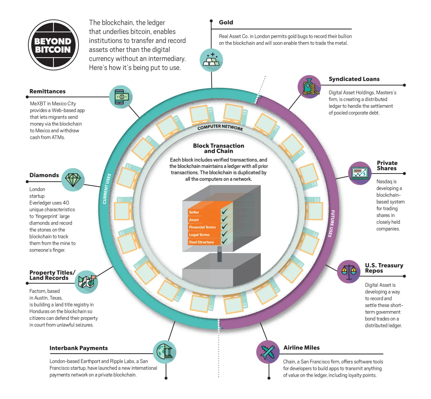 这些企业中的一些正在建立在实际的比特币区块链上。6月,纳斯达克与位于旧金山的Chain公司合作,启动了一个项目,利用区块链在交易所的私人市场上发行和转让非公开公司的股权。“区块链将为金融市场带来我们前所未见的效率水平,”纳斯达克首席执行官鲍勃·格里费尔德说。“随着时间的推移,它可能对后台的影响就像电子交易对公开喊价的影响一样。”