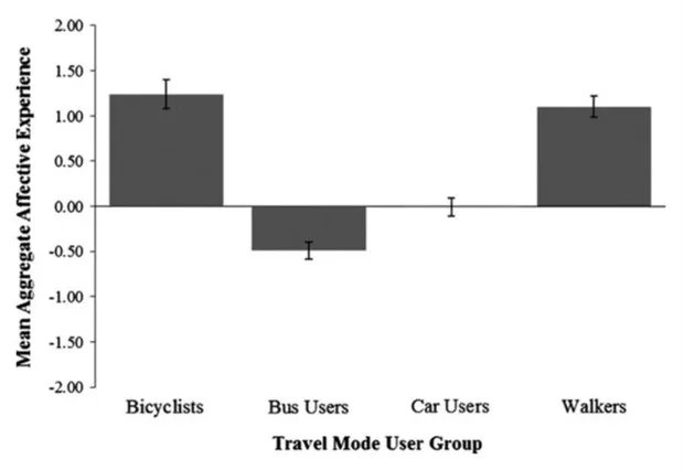在一项独立分析中,基于自我报告的工作旅行满意度评分,托马斯和沃克发现骑行者和步行者对他们的通勤方式有最高的情感评价——显著高于驾驶者,而驾驶者又显著高于公交乘客。这些发现与 之前的研究一致,显示积极的交通方式会导致更快乐的通勤。骑行者通常对他们的旅行持积极和兴奋的态度(尽管并不总是放松);步行者则持积极和放松的态度(尽管并不总是兴奋);公交乘客嘛,就是公交乘客。