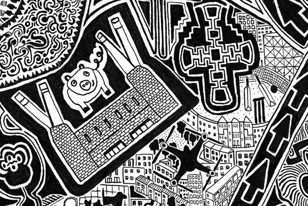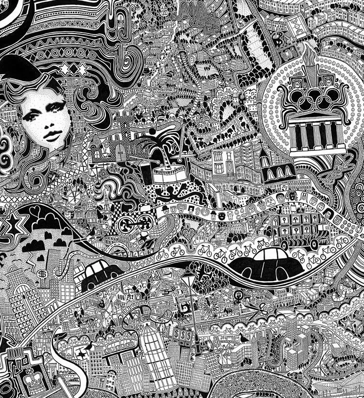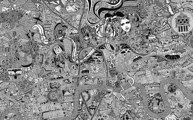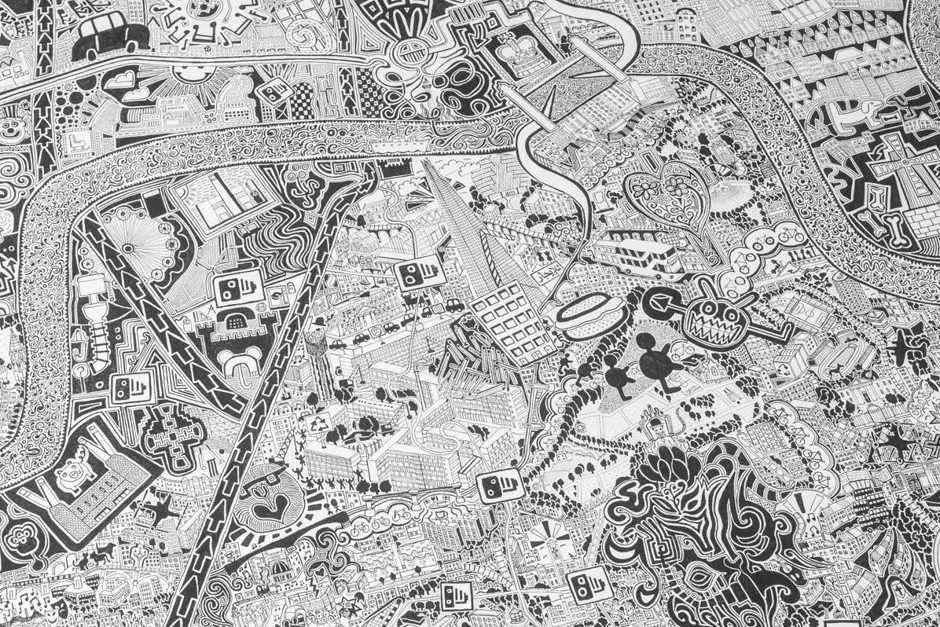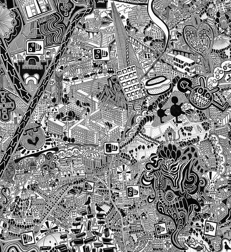 “伦敦城”是来自加雷斯·伍德的迄今为止最雄心勃勃的项目,这位疯狂的制图师也被称为 富勒。这是他之前对 布里斯托尔 的处理的三倍,后者仅花了三年时间绘制,而这项努力在每一寸中都闪耀着光芒。这个繁忙的城市中有开膛手杰克、 自行车超级高速公路、成群的肮脏鸽子和监控摄像头、一个爱好者的四旋翼无人机、那只 漂浮的猪,来自平克·弗洛伊德专辑封面,可能还有艺术家本人,以一对粗糙的膝盖的形象出现在女王伊丽莎白奥林匹克公园的西侧。