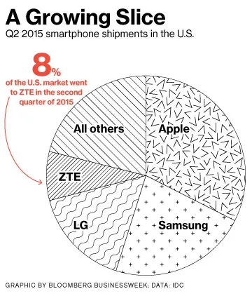 ZTE正悄然成为美国市场的一股力量,通过以低价销售足够好的手机——小型预付费智能手机售价30美元,配有QWERTY键盘的基本手机价格大致相同,等等。这家中国公司的产品在美国四大运营商中的三家中都是廉价手机的首选。(Verizon不销售它们。)ZTE在今年第二季度占据了美国智能手机市场约8%的份额,研究机构IDC表示,较2014年第一季度的4.2%有所上升。这使得该公司在智能手机制造商中排名第四,仅次于苹果、三星和LG。“我们从无到有,现在我们是一支强大的力量,”ZTE美国业务负责人Lixin Cheng说道。