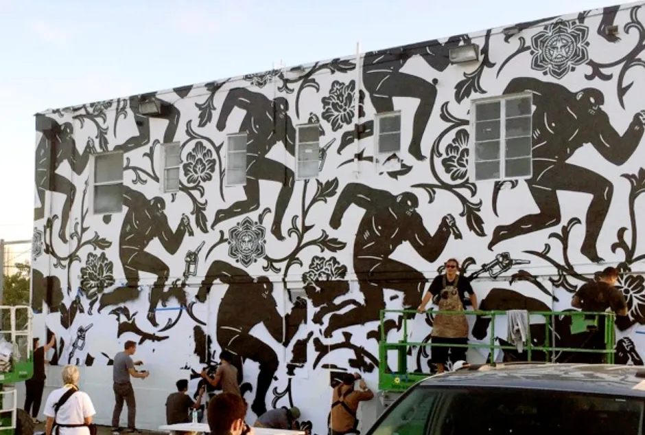 谢帕德·费雷(左下角,灰色衬衫)在2014年于迈阿密的温伍德地区为名为“权力与荣耀”的壁画做最后的润色。路透社/扎卡里·法根森谈到街头艺术家,谢帕德·费雷几乎是最主流的代表。即使你不知道他的名字,你可能至少会认出他的一些作品:那张被广泛模仿的“希望”海报,它成为了巴拉克·奥巴马2008年总统竞选的象征,以及“服从”系列,展示了摔跤手安德烈·巨人的神秘面孔。现年45岁的费雷,最初是在罗德岛的普罗维登斯市的深夜贴上他的作品,但现在他的作品已被多家主要博物馆收藏,并为黑眼豆豆等流行音乐团体设计了专辑封面。