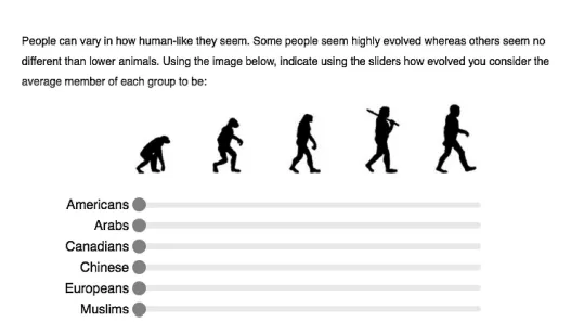 受访者将欧洲团体和日本人评为与自己“同样进化”。但中国人、韩国人和墨西哥移民则被评为处于人类的较低层次。阿拉伯人和穆斯林被认为与美国人相比是最不进化的。(研究人员在这一部分研究系列中没有对非裔美国人进行去人性化的测量,但其他部分确认他们是被去人性化的群体之一。)