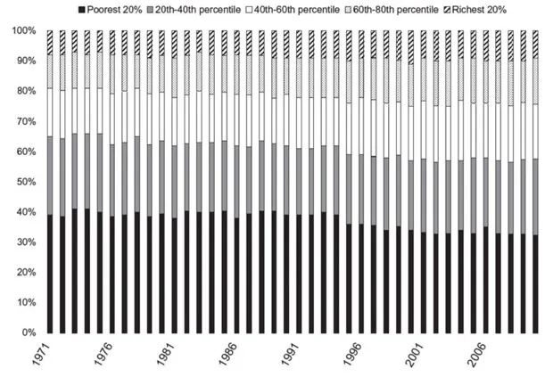 “如果我们考虑非裔美国人的绝对收入,而不是他们在收入分配中的相对位置,新研究显示几乎没有改善,”沙基写道。“非裔美国男性的收入没有任何增长,而非裔美国女性由于劳动参与率的稳步提高所获得的收入增长,远低于白人女性。”