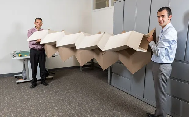 工程师Glaucio Paulino和Evgueni Filipov与他们的“拉链管”原型。Rob Felt/伊利诺伊大学提供一张纸可以轻易地弯曲、扭曲和撕裂。但经过多次折叠后,它变得坚硬,可以支撑比自身重很多倍的物体。这就是“折纸工程”的基本理念,这是一种基于几个世纪前日本艺术形式的新兴结构工程技术。