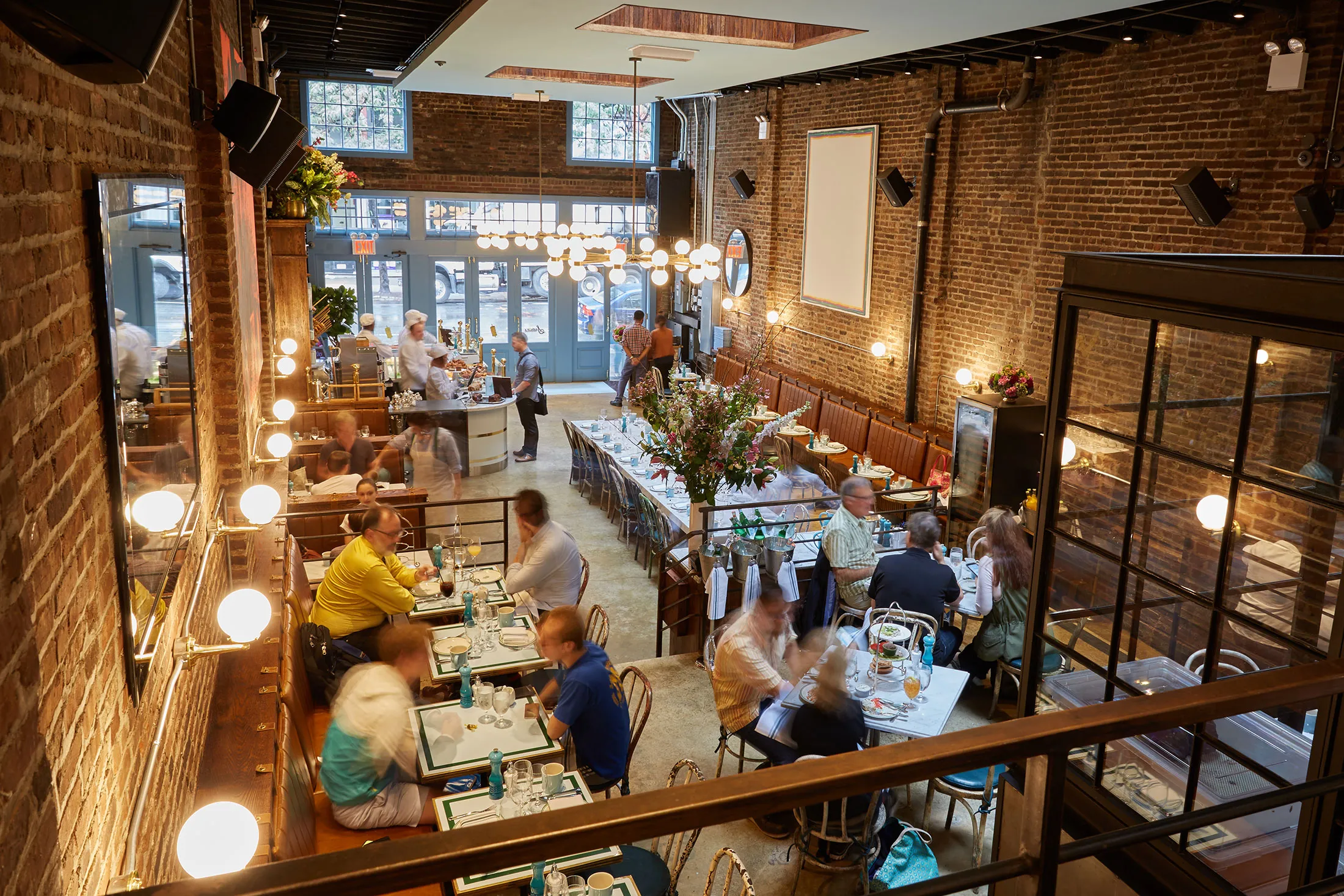 Sadelle’s的内部。摄影师:扎克·德宗/Bloomberg你在Sadelle’s餐厅中央看到的烤箱——一个旋转的四层鱼烤箱,配有一个洗涤板的水槽——在早上四点开启。到五点时,它的温度足够高,可以完成工作,保持在400到450度之间。到早上六点,年轻的摩洛哥裔面包师瑞兹兰·菲扎兹找到了她的节奏。她从麦芽沸水的锅中舀出肥厚、滑腻的环状面团,并将蓬松的面团直接翻到金属烤箱上。她在嗅探面包准备好的确切时刻。