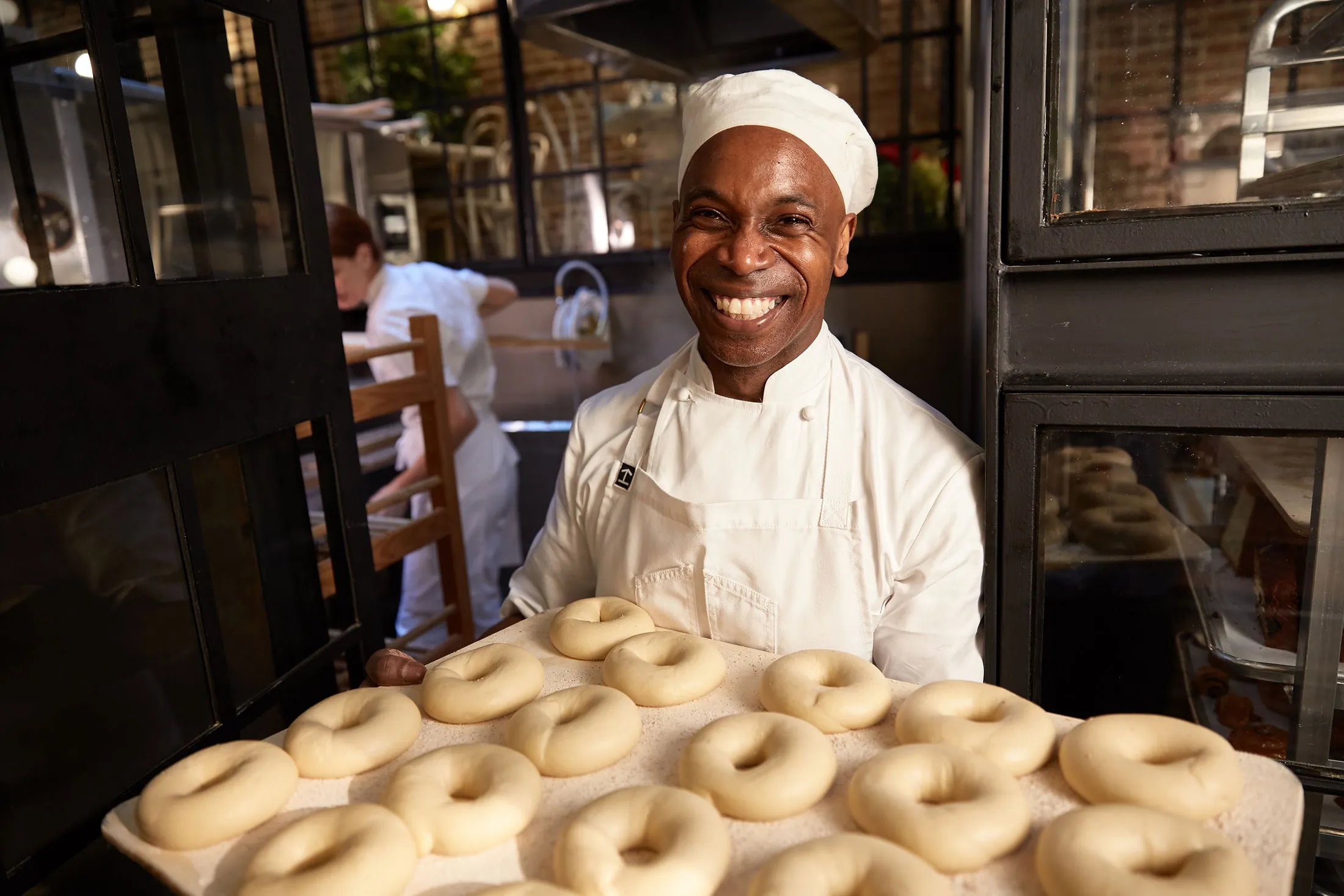 换句话说,贝果的生命是短暂的。所以当你听到梅丽莎·韦勒和她的团队在早高峰时大喊英语中两个最甜美的词,“热贝果!”时,请迅速行动!这每20分钟就会发生一次,在 Sadelle’s,这是韦勒两周前在苏荷开设的面包店。贝果光滑、嚼劲十足、酥脆,三者兼具——闪烁着盐,鼓胀着洋葱,点缀着罂粟种子。目前,每天生产1,200个。