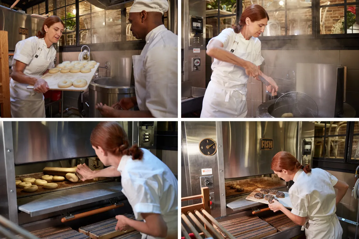 在快速连续送下九个芝麻贝果后,调整所有设置(上热、下热、颜色控制),Weller找到了当天的完美设置(7, 4, 5.5)。这使得切开的贝果表面呈现出淡金色的花边,边缘均匀地棕色且酥脆。“哦,是的!这正是我想要的,”她对厨师们说,同时记录下设置。“但你看,这永远不会是一种尺寸适合所有人,”她说。“要做到这一点,我认为总是要依赖于贝果。”