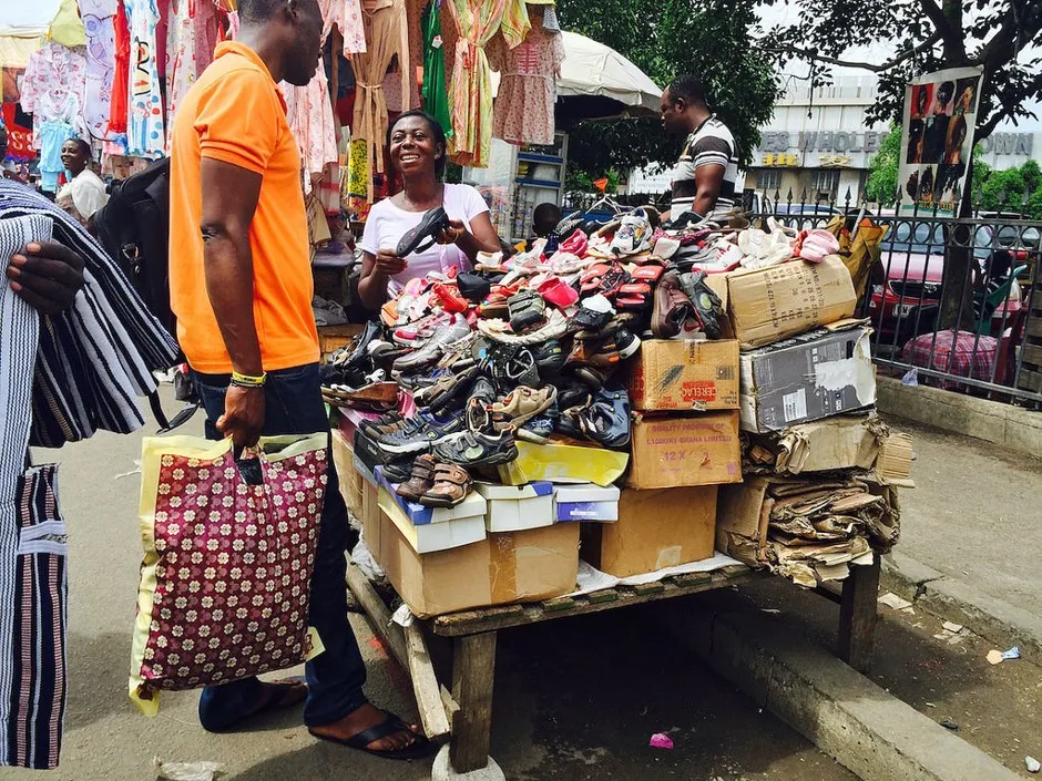 店主、街头小贩和顾客用当地语言——特威语、加语和方特语——的对话和讨价还价装点着空气。这是一种熟悉的街头节奏。一位老人走过,自己唱着歌。小贩们向路人呼喊,打招呼、招呼和其他引起注意的方式,希望吸引潜在顾客。