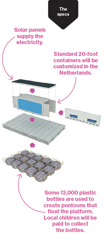 荷兰建筑师库恩·奥尔图斯认为他有解决方案:他的浮动城市应用是由集装箱建造的结构,可以停靠在水边的贫民窟旁。第一个将在孟加拉国达卡部署,计划于今秋投入使用,配备20个计算机工作站。白天将用作教室,晚上则作为互联网咖啡馆。联合国教科文组织和当地非营利组织正在补贴建设。由于这些单位是船只,它们将符合保险和私人融资的资格,这也可能使它们成为当地企业的有吸引力的选择。