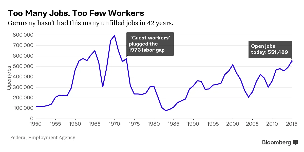 在1950年代和1960年代,德国同样寻求移民来填补工厂,因为经济繁荣。该国从希腊、土耳其和南斯拉夫等国招募了“客工”,这些人在第二次世界大战后推动了经济增长。