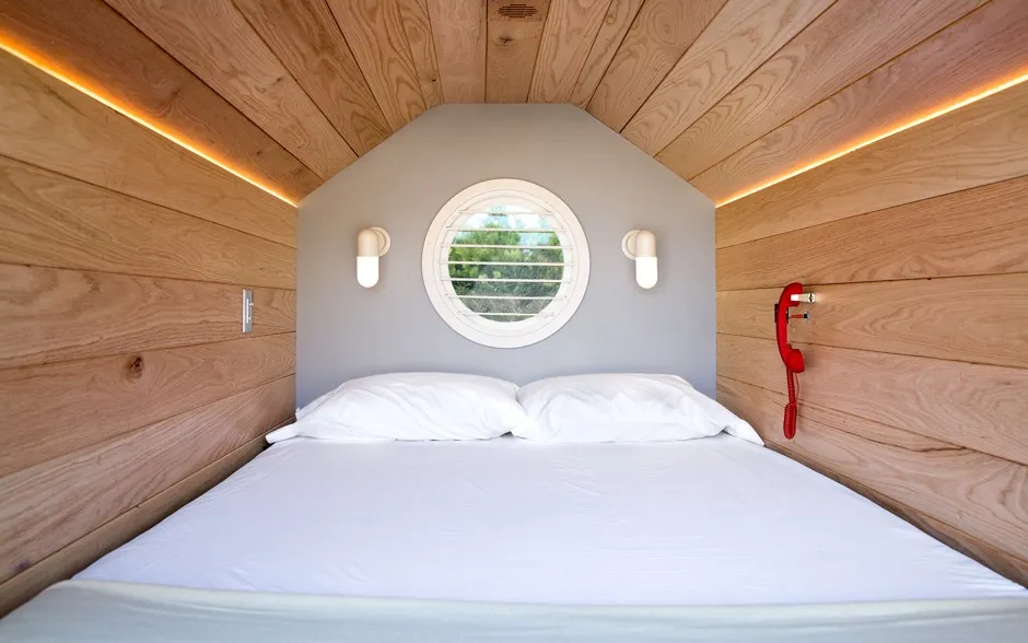 每个舱位都配备了一张全尺寸床垫、干净的床单,以及一种木色和白色的配色方案,让人联想到一个时尚的水疗中心——或者一个斯堪的纳维亚的小房子。想象一下,一个微型的宜家房间,装在轮子上。每10分钟,工作人员会轻轻叫醒那些打盹的人,或者把一群朋友从自拍的恍惚中唤醒。然后下一个人爬上两步,安顿在舱位里。