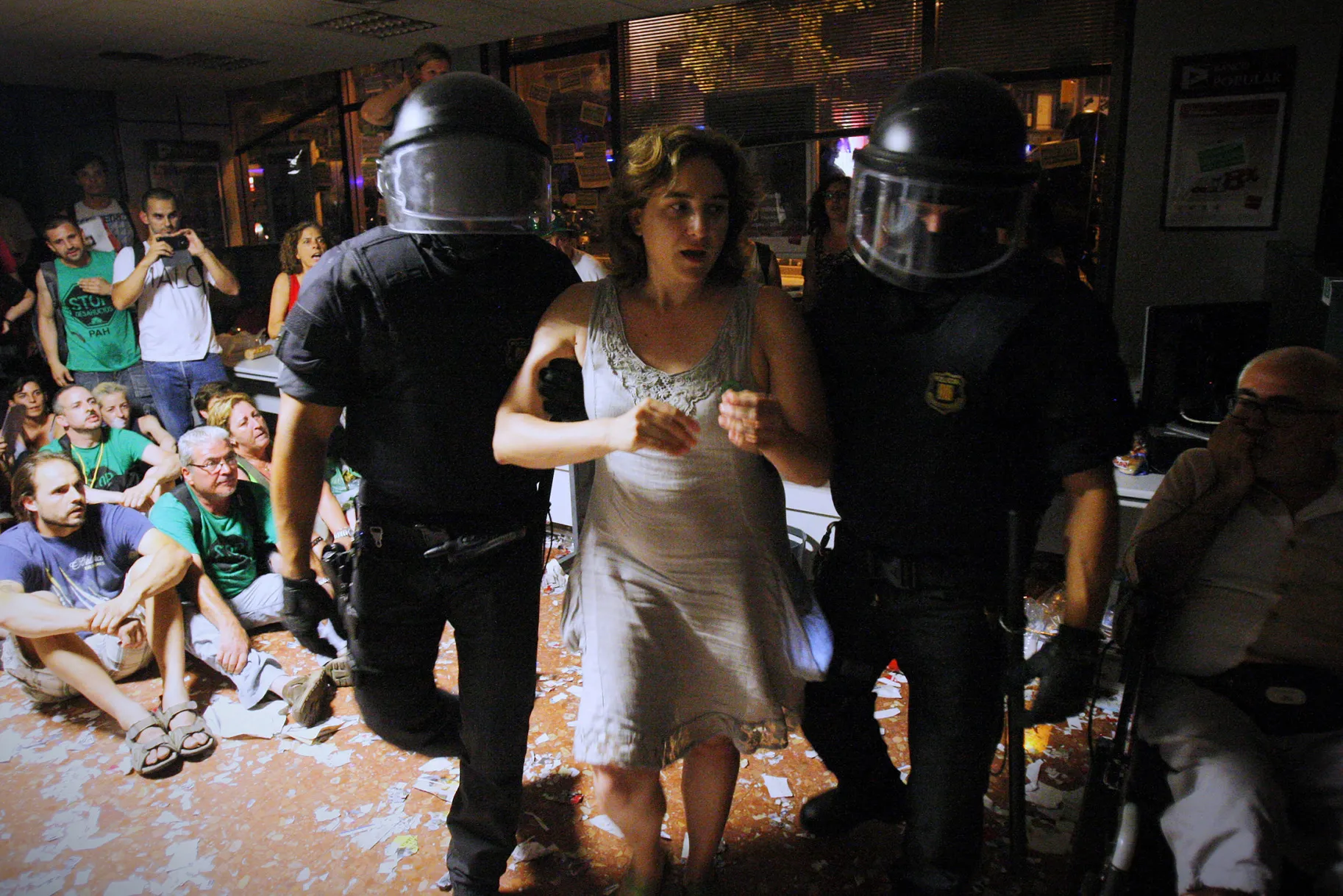 科劳(中)在2013年7月26日巴塞罗那的一次抗议活动中被警察抬出,抗议支持一位面临驱逐的邻居。
