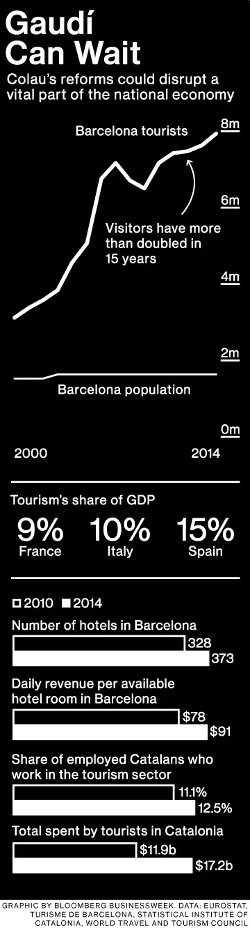 当巴塞罗那在1992年举办奥运会时,酒店数量极少,组织者租用了11艘游轮来容纳游客。根据普华永道的数据,2013年,巴塞罗那是欧洲第四大旅游城市,尽管酒店平均每年开业约10家,但酒店房间的需求仍超过供应。这使得该市的酒店成为欧洲大陆上最昂贵的酒店。在过去四年中,旅游业增长了18%;该行业占城市国内生产总值的12%。对科劳来说,这种影响令人担忧地让人想起住房泡沫——一种社会破坏性的投资激增,使少数人富裕而牺牲了许多人。“增长强劲,这应该作为一个警告,因为它可能产生不平衡,”她说。“我们不想重蹈房地产繁荣的错误。”