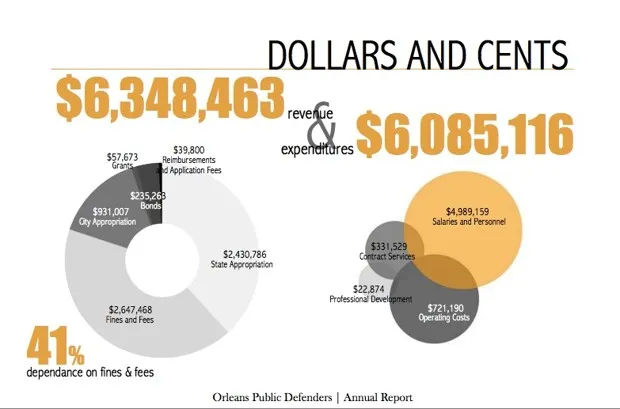 新奥尔良公设辩护人2014年年度报告路易斯安那州在依赖与未支付交通罚单等轻微指控相关的罚款和费用来资助公共辩护服务方面是一个特例。这使得新奥尔良的法院系统面临一个联邦集体诉讼,该诉讼于上周提起,声称法官没有评估贫困被告支付这些罚款的能力,并且在他们不支付时,过于频繁地将他们监禁。