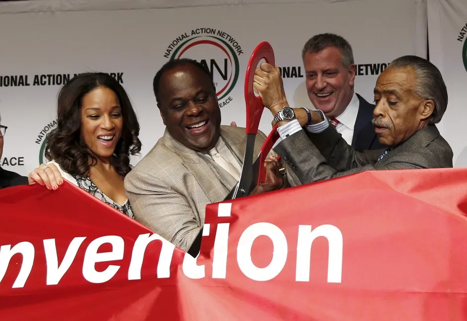 纽约市市长比尔·德布拉西奥与阿尔·夏普顿剪彩庆祝路透社/迈克·塞加尔在布莱恩·伯罗的 个人简介 中,有两点很有趣,讲的是纽约市市长比尔·德布拉西奥在本月的 《名利场》.