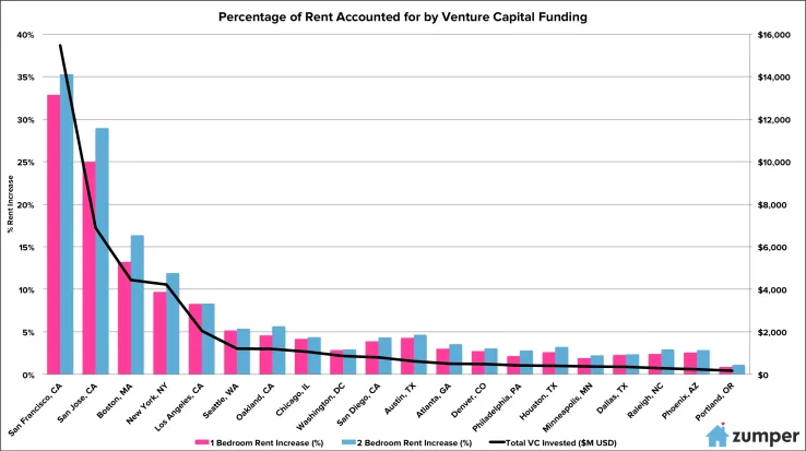 “Zumper发现,每注入10亿美元风险投资到当地经济中,1卧室的租金将增加每月69美元,2卧室的租金将增加每月99美元,”报告总结道。在美国的科技中心——即圣荷西、波士顿、纽约、洛杉矶、西雅图,尤其是旧金山——风险投资显然正在推动租金达到前所未有的极端。而且,由于租金在上涨,科技资金也在流入,为什么情况不会如此呢?
