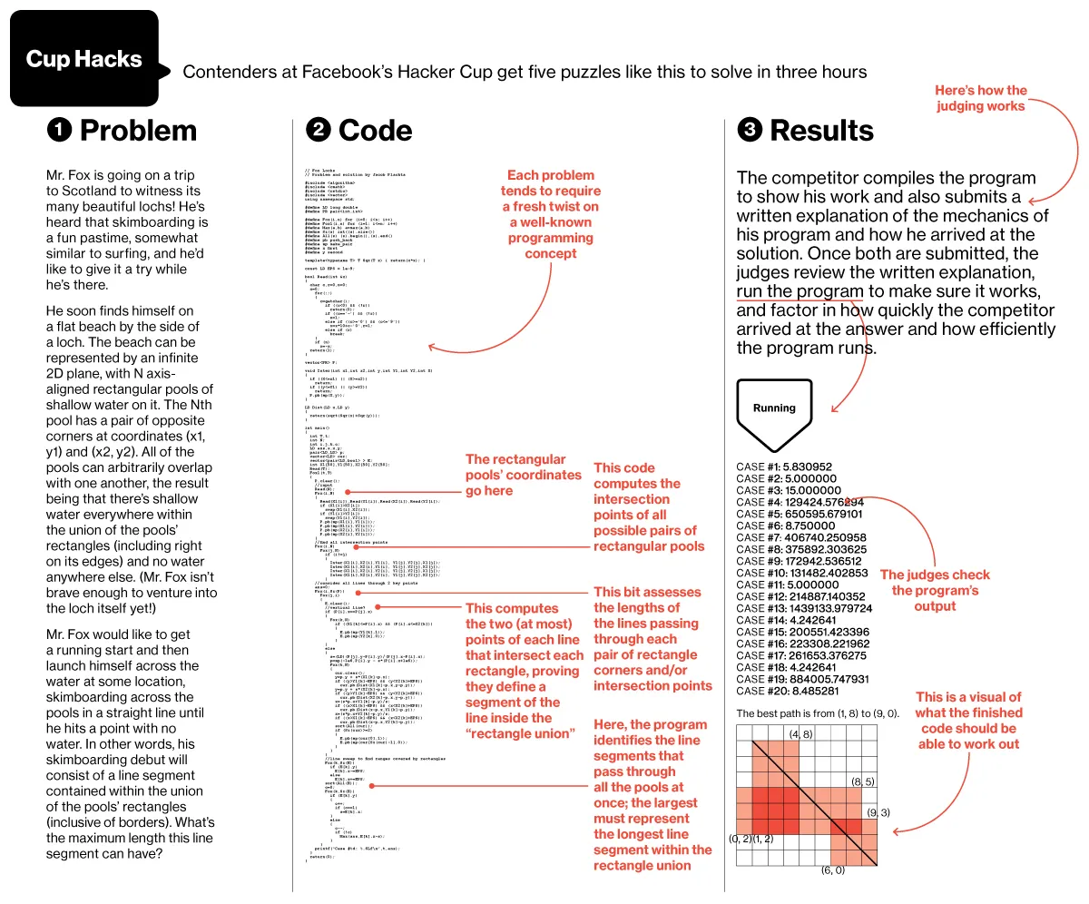 黑客杯的进行方式与其他编程比赛大致相同:在三小时内完成五个谜题,顺序不限。尽量保持编程的高效。代码越干净、越准确,所用时间越快,名次越高。一种常见的问题可能是要求在给定多个约束条件的情况下找出旧金山和洛杉矶之间的最短路线。或者问题可能是关于如何以特定模式铺设地板。问题通常围绕着一个众所周知的算法或数学结构,带有新鲜的变化。精英运动编码者必须迅速找出潜在的逻辑,然后相信自己的能力。“你必须在早期就说服自己,你所做的事情是有效的,”Facebook的软件工程师韦斯利·梅说,他帮助管理黑客杯。