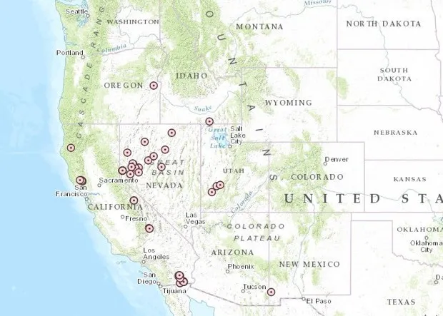 地热电厂主要集中在西部,特别是在内华达州、南加州以及旧金山北部山区的蒸汽田水库上方。后者拥有美国第一座地热电厂的地热田(于1960年开业),现在是 全球最大的地热设施: