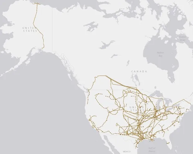 原油和石油产品管道与港口和炼油厂相连,例如墨西哥湾、新泽西、大湖区以及西雅图附近。远在北方的是阿拉斯加输油管道系统,从普鲁多湾延伸到仍然被石油污染的瓦尔迪兹,被称为美国最北端的无冰点。请注意,这里没有显示许多在加拿大的管线: