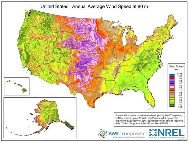 这可能是因为该地区风速不大。报告称,那里平均风速为每秒4到5米,可再生能源世界,而平原地区为每秒7.5到9米。你可以理解为什么在 这张地图中,在国家可再生能源实验室的中部地区布满风电场是明智的(风速在262英尺高处测量):