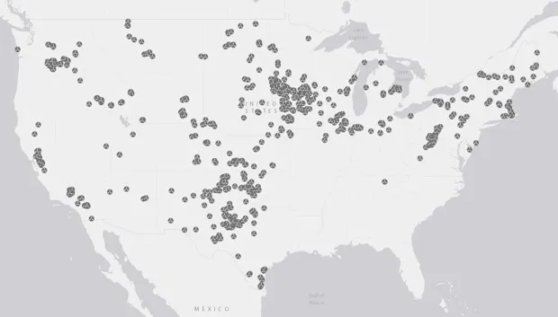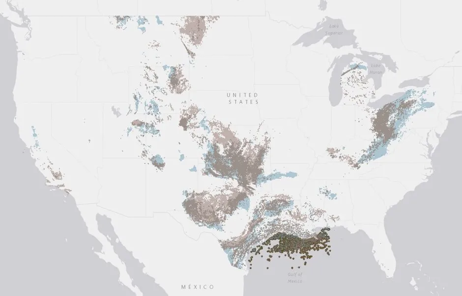 你住在油井或天然气井附近吗?好吧,这里就是,它们的油用棕色表示,气用蓝色表示(墨西哥湾沿岸的点是联邦水域的油气平台):