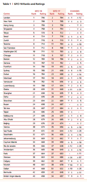 GFCI的新报告根据对近3200名金融服务专业人士的调查以及来自世界经济论坛、联合国和其他来源的数据,对全球84个领先金融城市进行了排名。它在多个维度上对金融中心进行评分:商业环境、金融部门发展、基础设施、人力资本以及声誉和一般因素。下面的表格来自报告,列出了全球43个领先金融中心。
