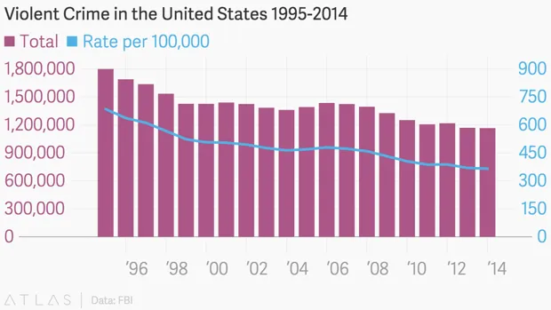 联邦调查局的数据确实显示出加重攻击和强奸案件的增加。而且数据仅到2014年底,因此2015年的数字最终可能会显示出稍微不同的故事。正如我的大西洋同事马特·福特指出,这是联邦调查局数据的一个关键局限性:你必须等很长时间才能获得更全面的情况。不过,总体而言,至少在去年并没有暴力犯罪流行。事实上,这是几十年来最不暴力的一年。