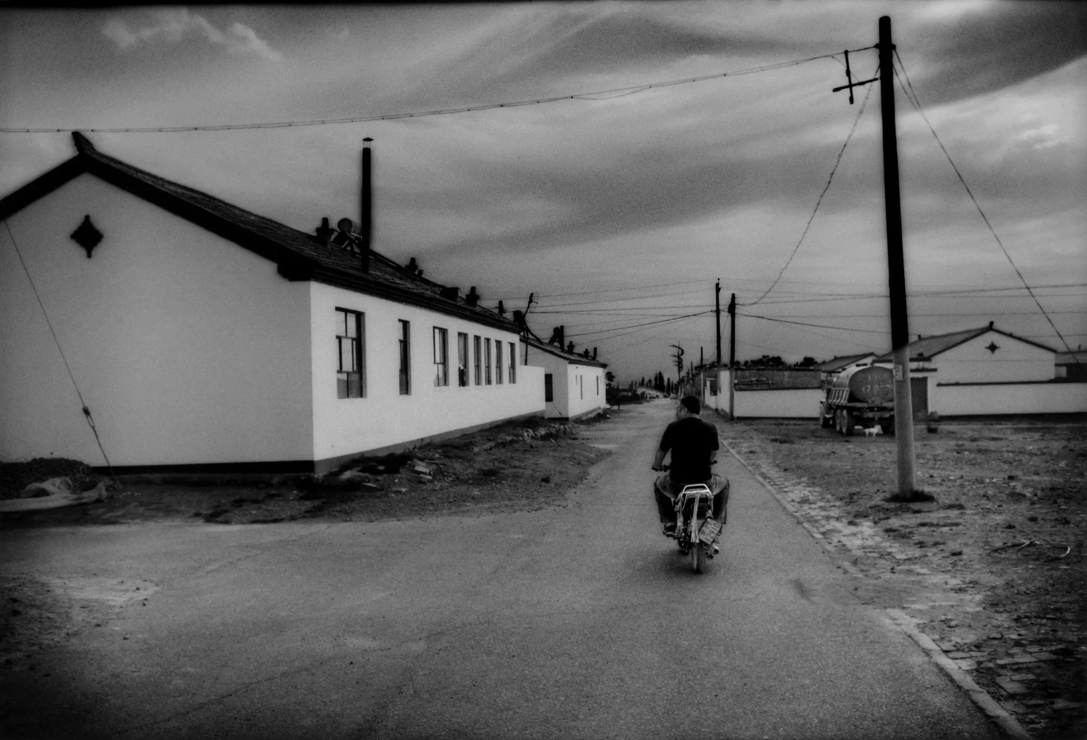 一名蒙古男子骑着摩托车驶入一个政府安置项目,位于巴彦浩特以南。